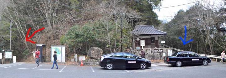 下山の時に解ったことですが、正規の登山道(階段多数)は後ろのタクシーの赤い矢印にあります。