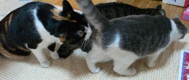 右にある青いのは靴べらで、ニャンコ親子が後姿で座ってます。