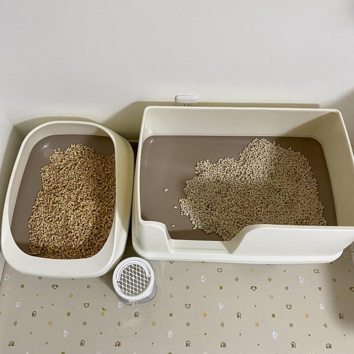 猫達の中では小さなストーブペレットのトイレはおしっこ用、大きなシステム砂のトイレは💩用と使い分けているようです