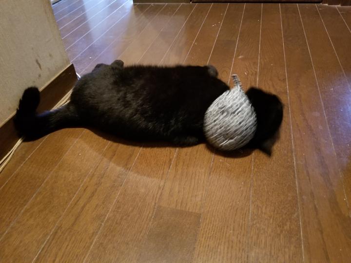 首の所のヒモを引っ張って荷物を出そうと必死なクロ