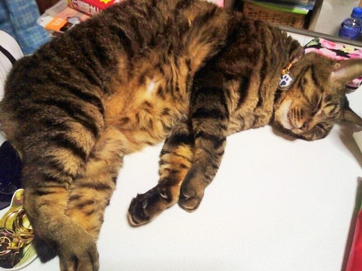 こたつ机の真ん中に堂々と転がり娘の小物を叩き落とす有能デブ食材。