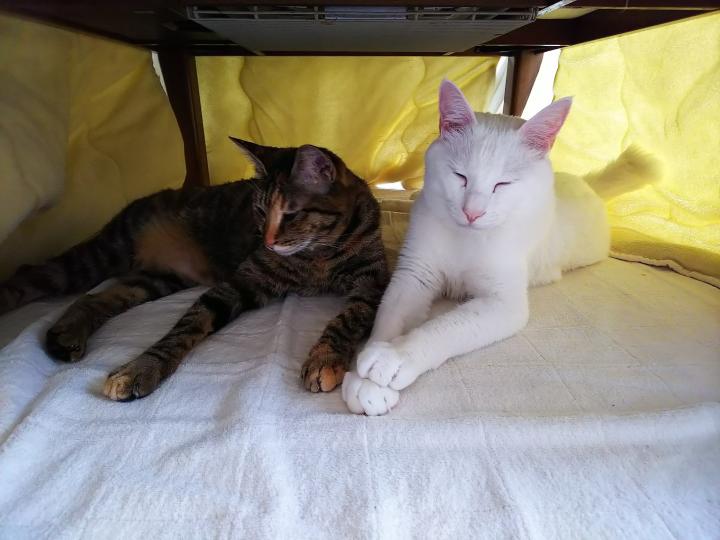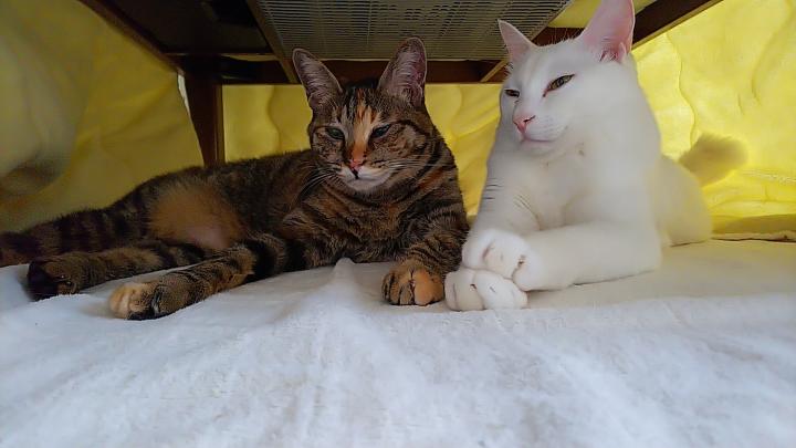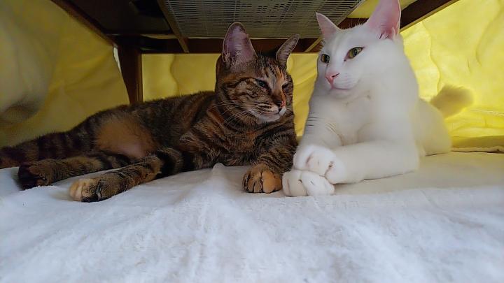 こたつ布団をあげると、いつも2匹で寄り添っています。