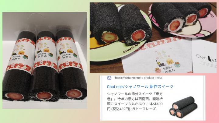 今日、シャノワールさんの恵方巻ロールを(半分ずつ)皆で食べました。恵方は西南西ですね。虎柄パンツの黒猫もカワイイ。