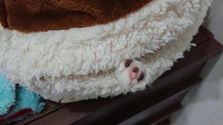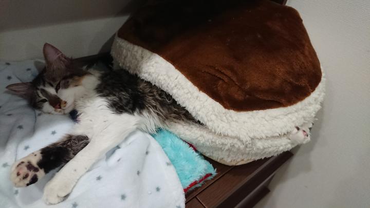 移転したご自分のお昼寝ベッドでお寛ぎのシャオくん。