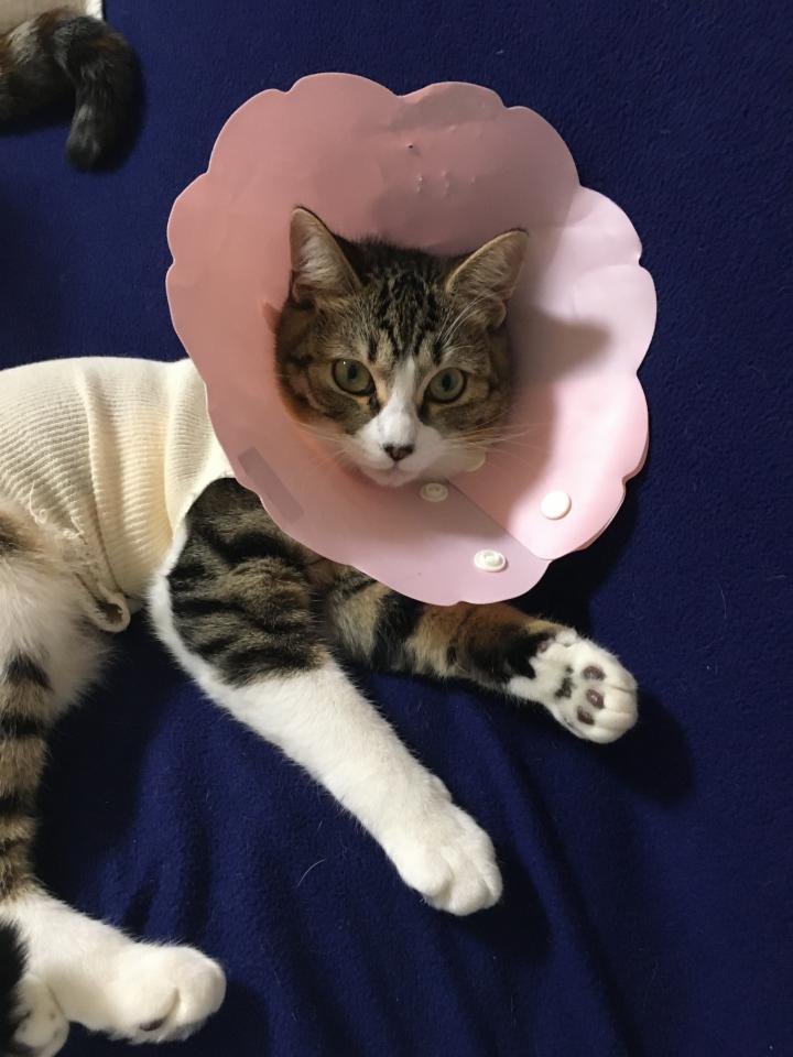 年始にゆずたんは避妊手術したのですが、簡易の術後着をボロッボロにしてしまったので、カラーを装着。