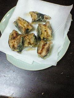 後は海苔と海苔の間を切って、小口になった秋刀魚に衣を着けて揚げてみました。