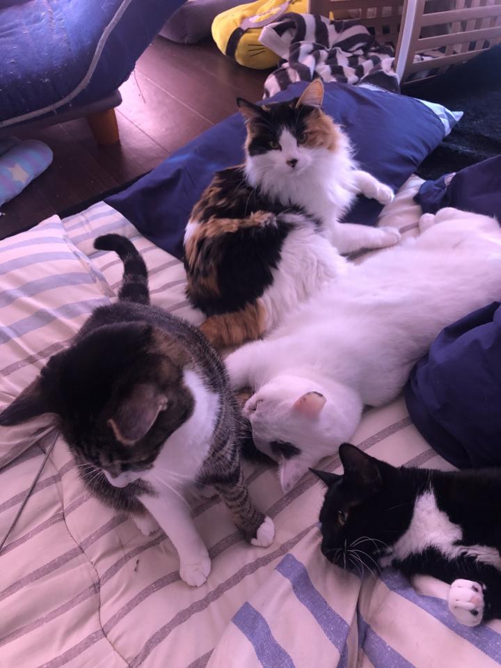 ペット可のマンション在住、結婚しました。 白サバ(♂)のキラとサバ白(♀)のレナの兄妹にゃんこの里親になりました。その後素敵なご縁の元、ハチワレミケ(♀)のモモと黒猫のケイの兄妹にゃんこの里親になり...