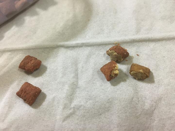 中にクリームが詰まったカリカリで、中身を一度出して薬を入れ、再び中身で蓋をするのです。