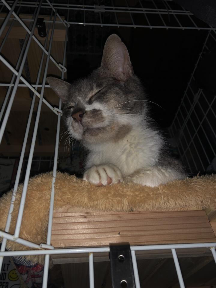 ニャオンがケージのトレイから落ちたのだろうと思いケージを除くと口呼吸で苦しそうなニャオン。