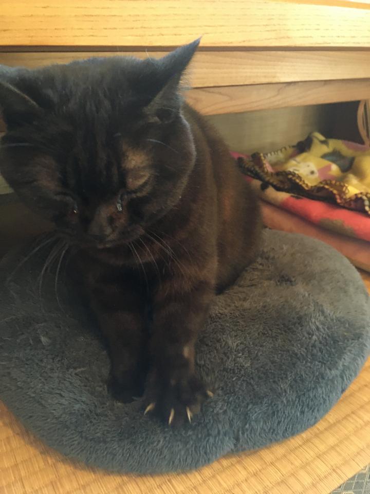 休憩室でお茶飲んでるとクロちゃん横に寄り添うように座ってくれました。