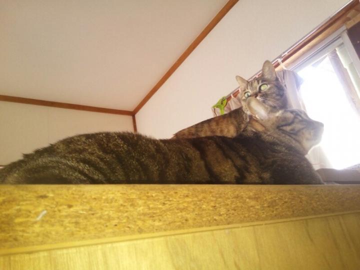 ヒーター前の陣取り合戦中。ひたすら父を無視する娘の図。