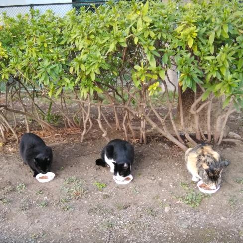 最近、ミケのいるいつもの公園に2匹の猫がやって来て一緒に食事