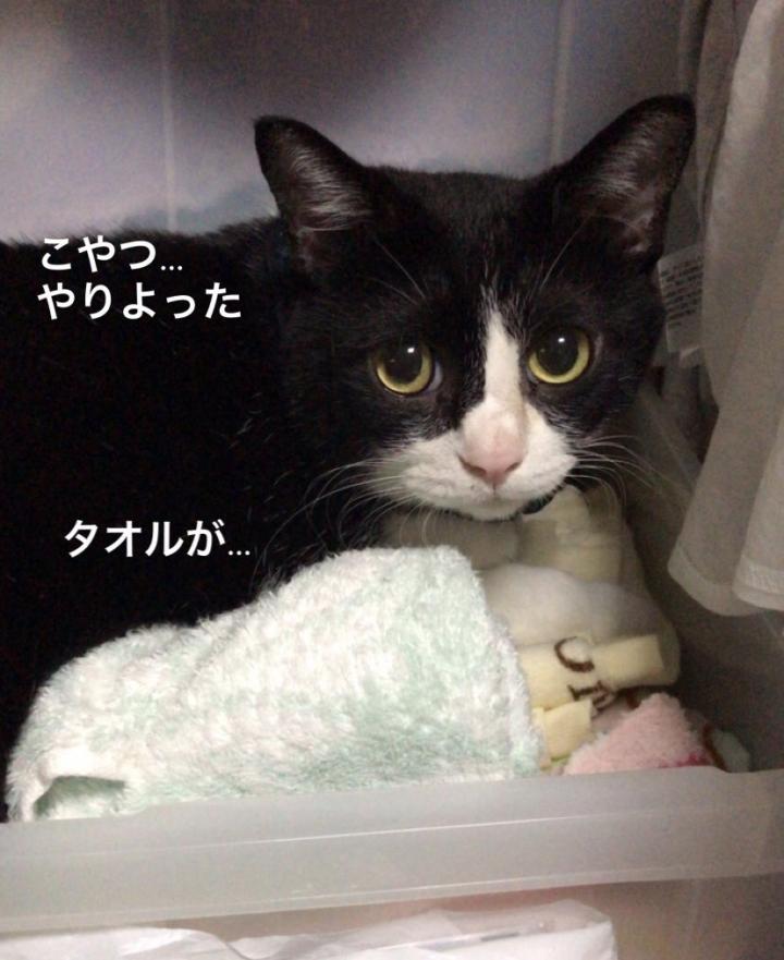 1枚目の写真は、収納ボックスから中の物を放り出して入り込んでいるとこ。なに?的なこの顔。ムキー!中のタオルはボロボロになりました(°▽°)