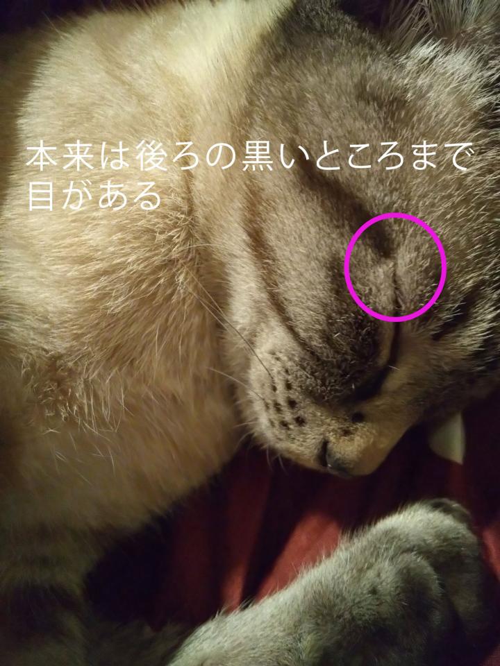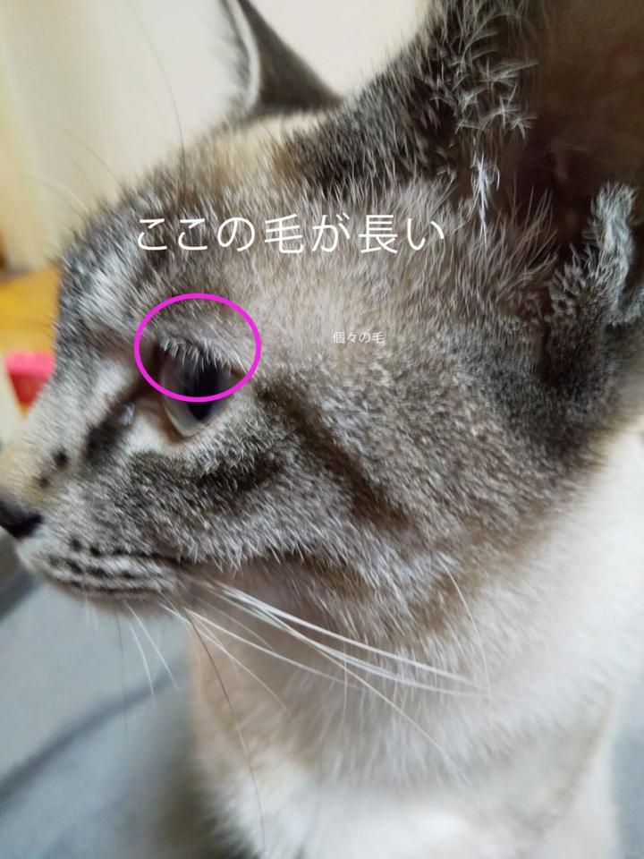 この目の切れ目と黒い毛の間が若干白いのと眉毛っぽい毛の長さで目を閉じると目が半分になっちゃう!と気づきました(笑)