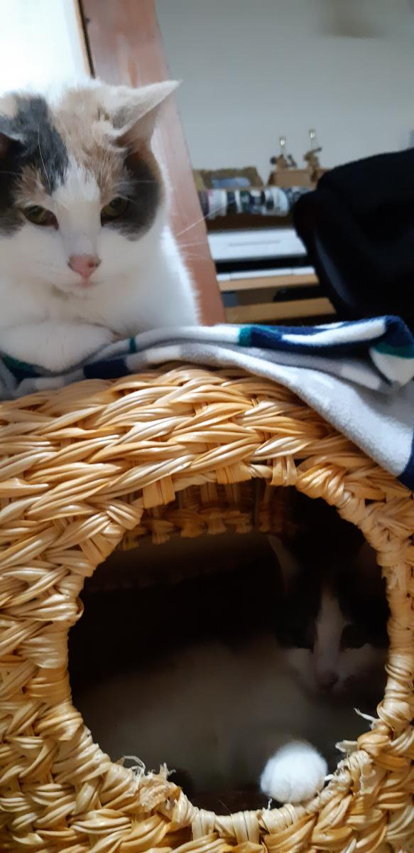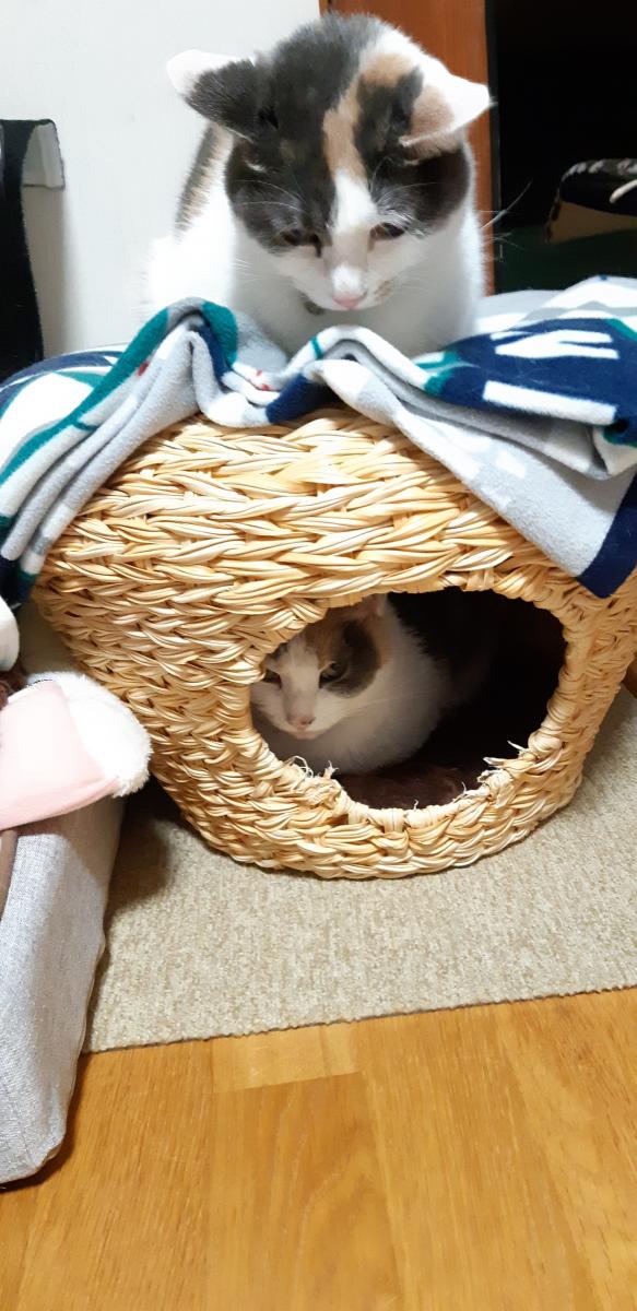 いつものように 杏は藤の小屋の中でくつろいで、桃は その上で一休み