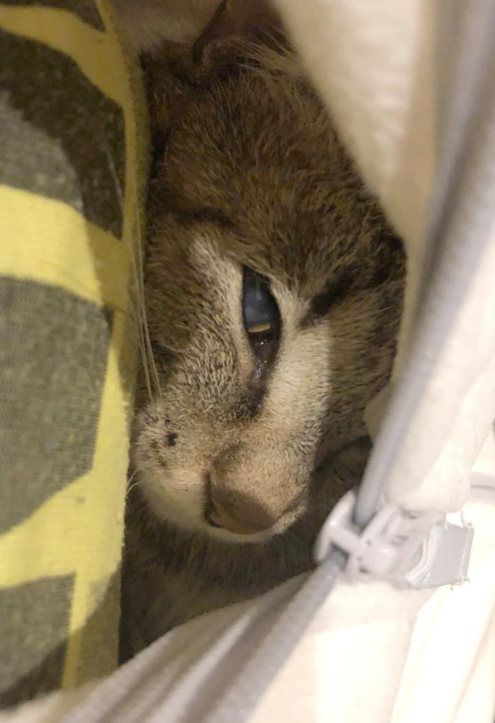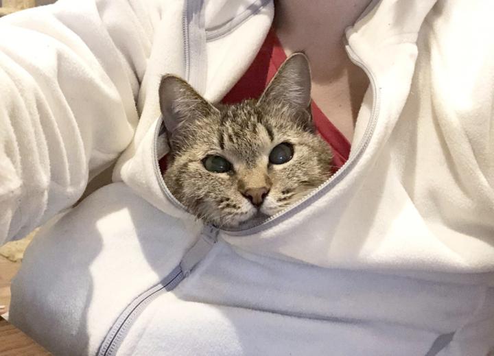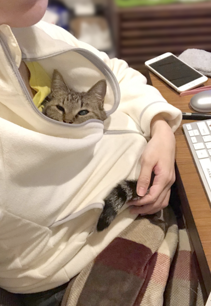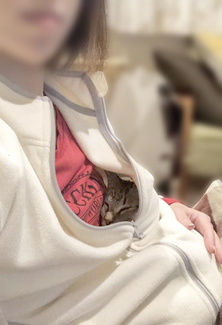 私、いつもぽてを膝に乗せるけど、もっと近くで感じたくて、試しに着てたフリースの上着の裾を広げて見せました。