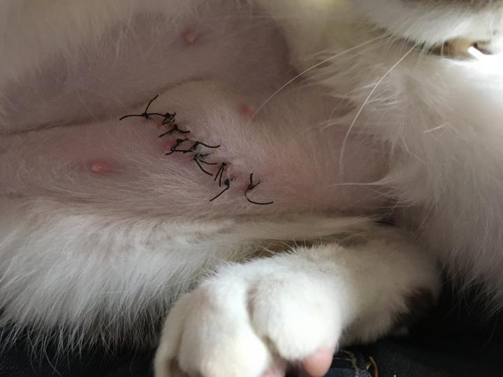 先月15日の避妊手術で縫った部分が腫れてると今日言われたそうで❗