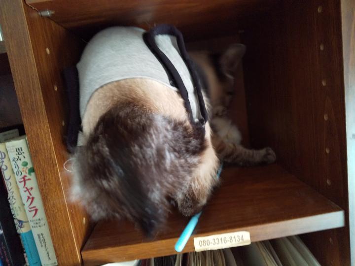 しっぽを触るとシャーシャーするシャルルをなだめてなんとか紐を外しました