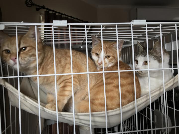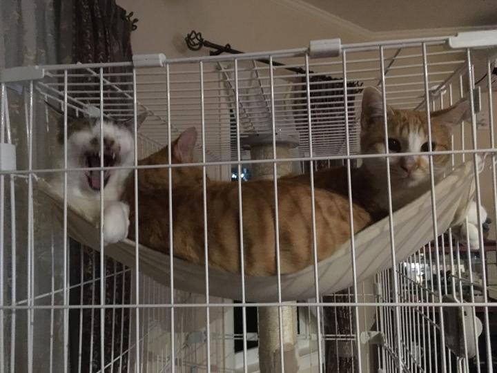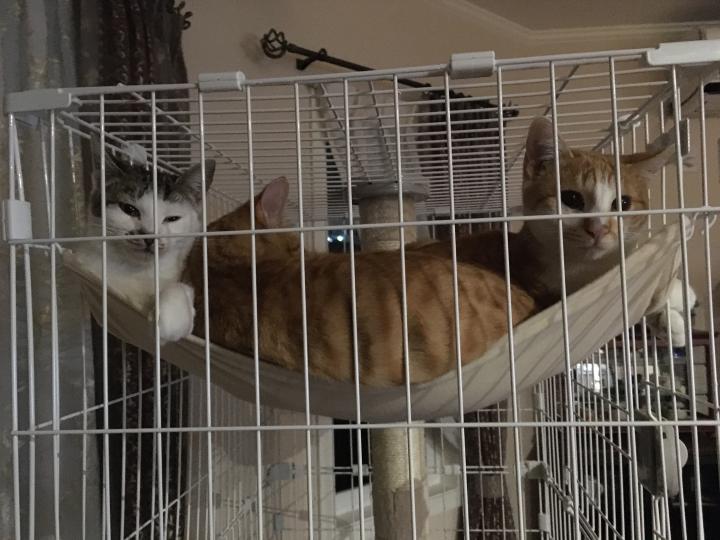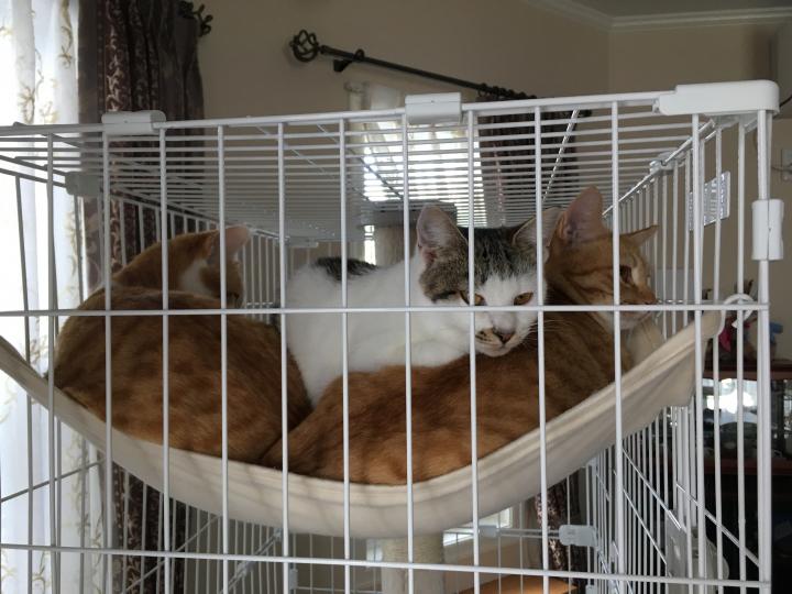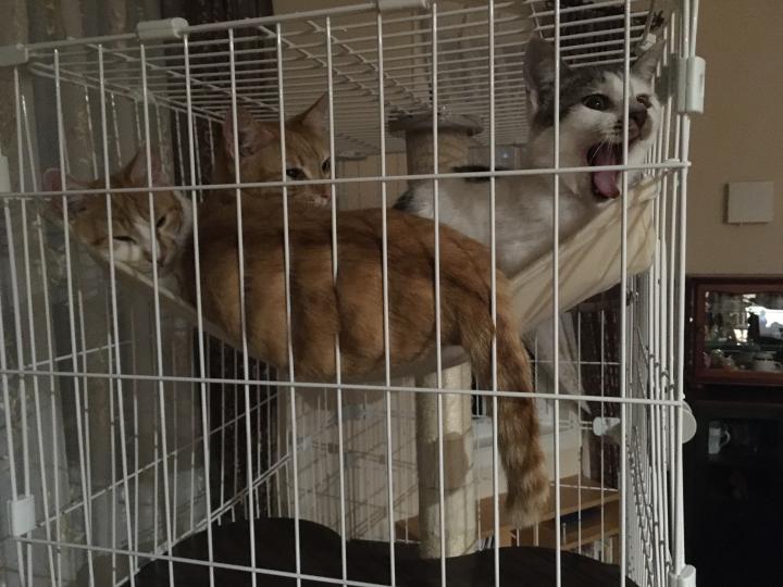飼い主の食事中や、じゃれ合いがエスカレートしたときなんかは、3段ケージに3匹とも入れちゃう😤