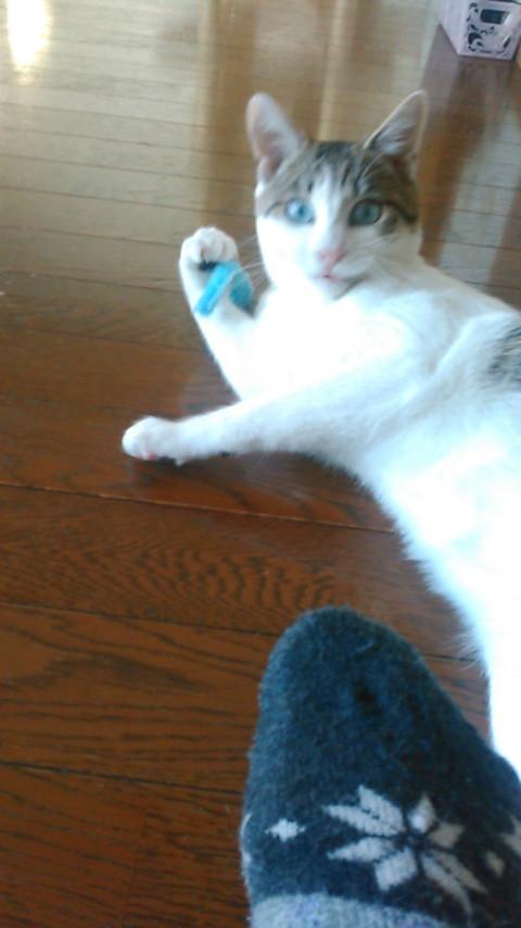 わざわざ足元までおもちゃ(獲物)を持って来て、私の足に絡みつきながらじゃれる福