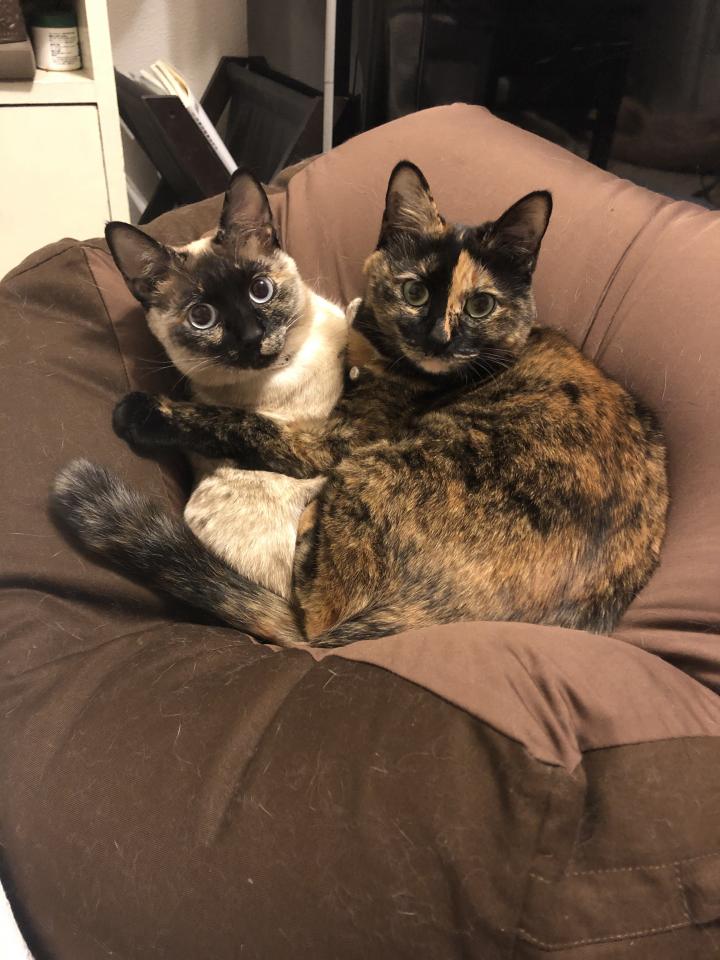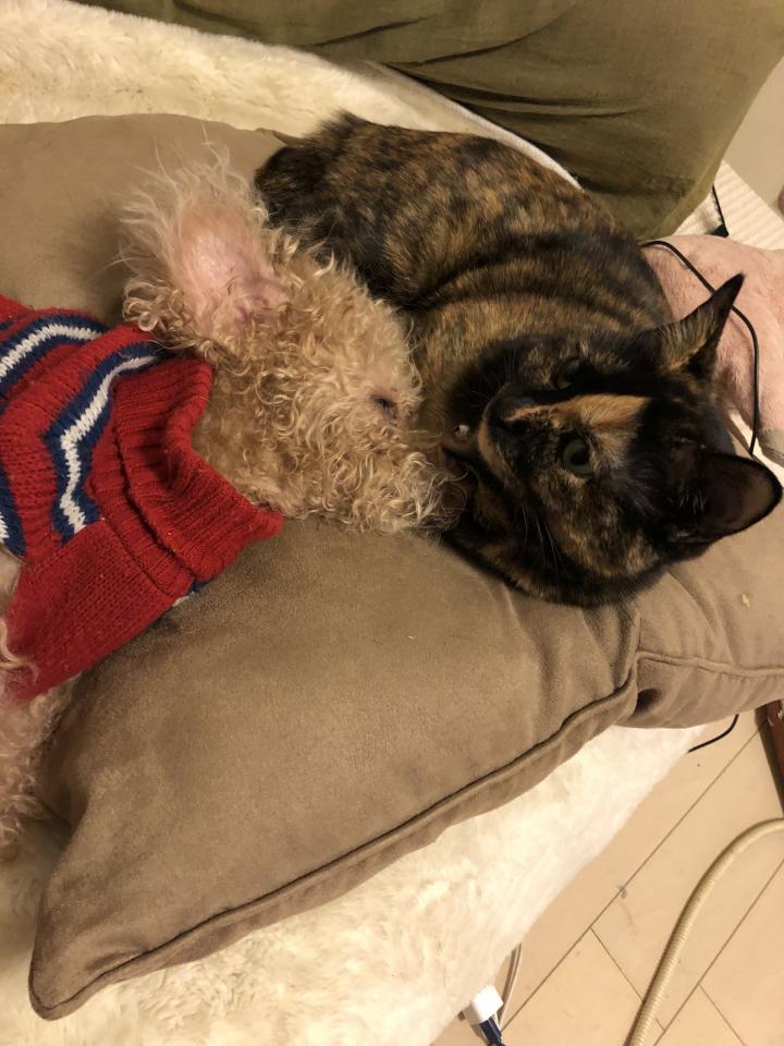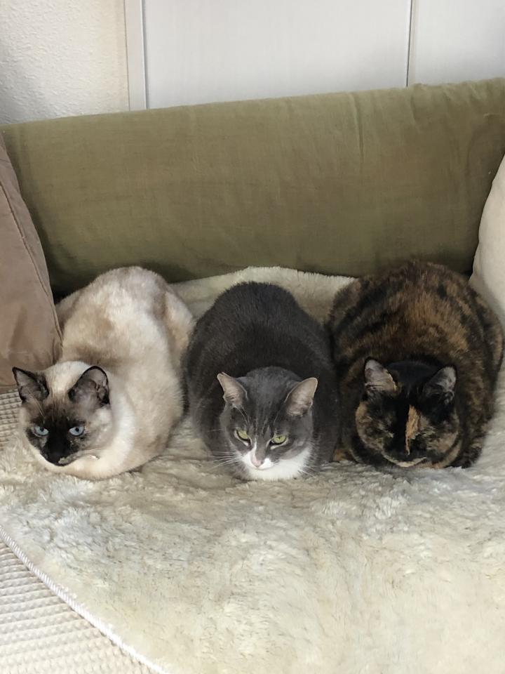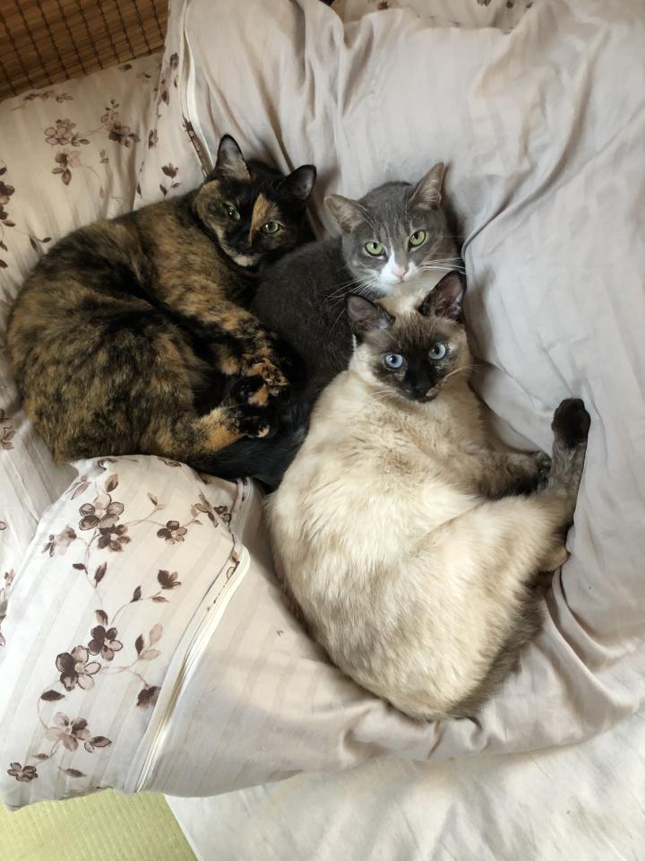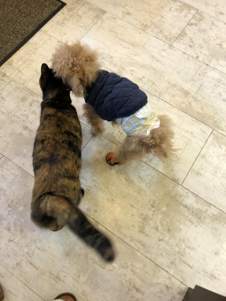 現在もうすぐ1歳になるエマちゃんと、トイプードルの老犬15歳二匹とも大人しく仲良しです。8月にハチとロクを迎えまして、朝方運動会を毎日しております。 エマちゃんが、猫語で、何やらニャ〜ニャ〜ウニャ...