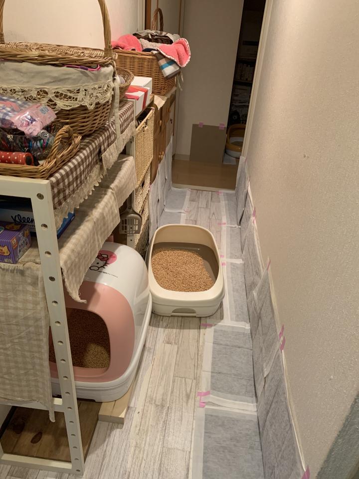 ウンチ用のトイレ(ピンクの方)もそばに置いたらそこでするようになり、今は粗相のため廊下いっぱいにシート貼ってインテリアどころじゃないです。