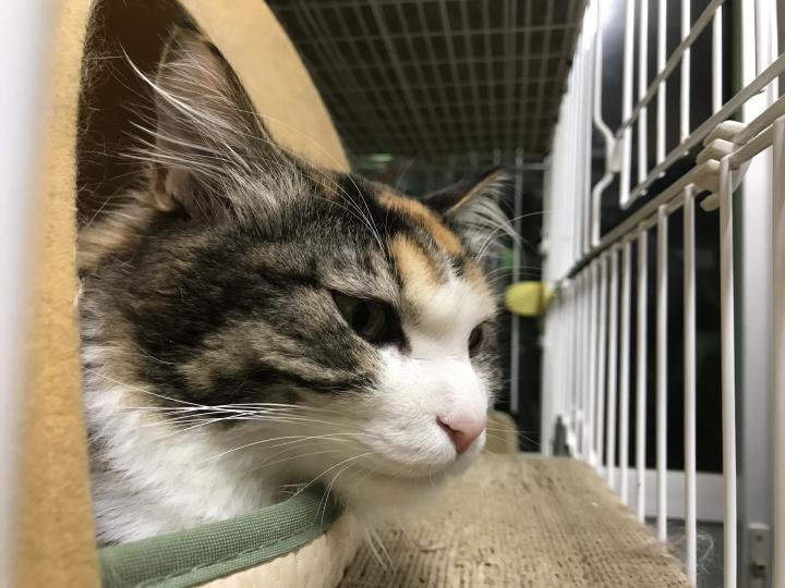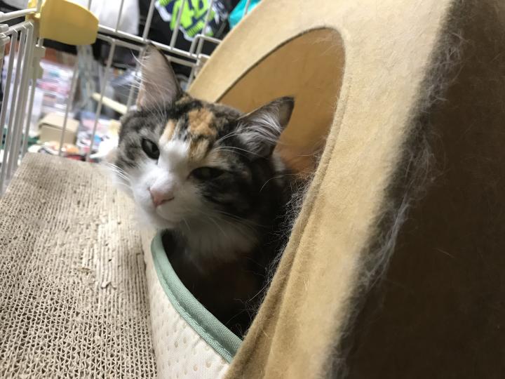事務所にはおはぎちゃんがいます。おはぎちゃんは毎日旦那さんと車通勤してます。お客さんや業者さんの出入りもあるので、事務所ではケージです。でもせめて上下運動はできるように、三段ケージ。狭い事務所にでかいケージ。