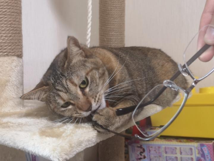 メガネのつるを嗅がせて、思い出してもらおうとしてる。
