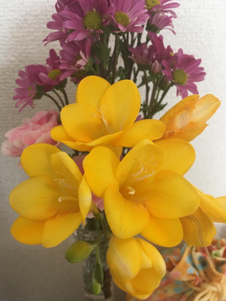 月命日に供えたフリージアが弱ってたのですが、この連休で元気になりみるみる花が咲きました🌸