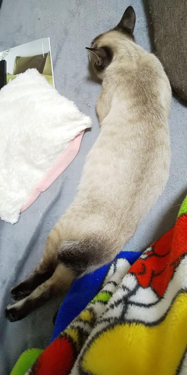 昨日は興奮おさまってから珍しくしっぽを上にして寝ていました。