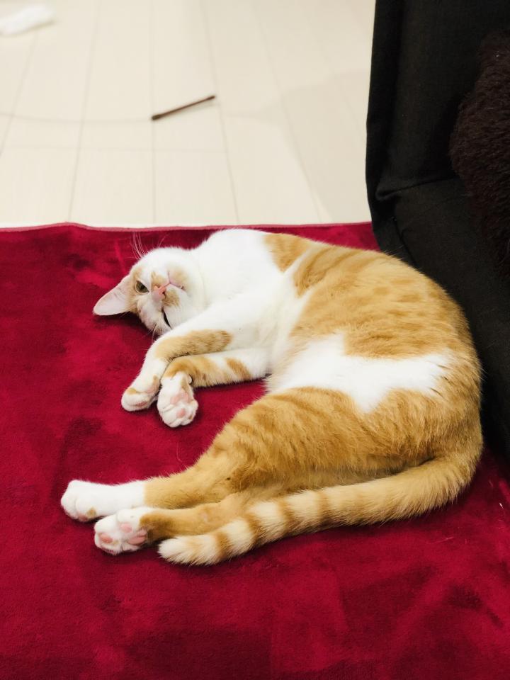 疲れて動けなくて横になったけど、猫じゃらしが目の前をヒョイヒョイすると、とりあえず手だけ出してくる時の写真😜