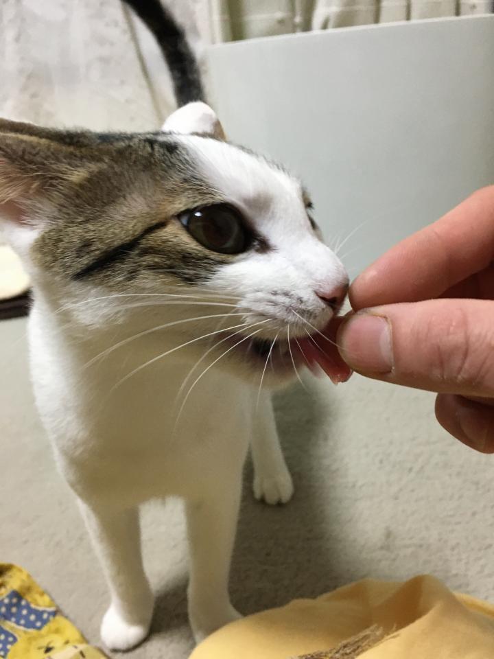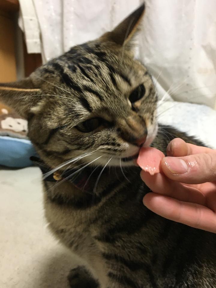 ゲンとミルクが自分が持って来たお魚を美味しそうに食べているのを見て、幸せそうに可愛い可愛い言ってる主人笑