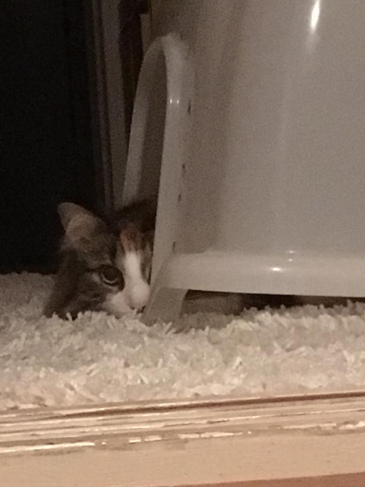 この写真はトイレの掃除しようとフタを外したらすぐさまフタに隠れてチラ見のラテさん♡