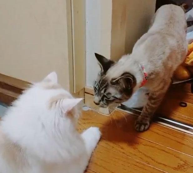昨日はシャルルが追いかけて、猫部屋に追いやると、スイが猫部屋からシャルルを追いかける