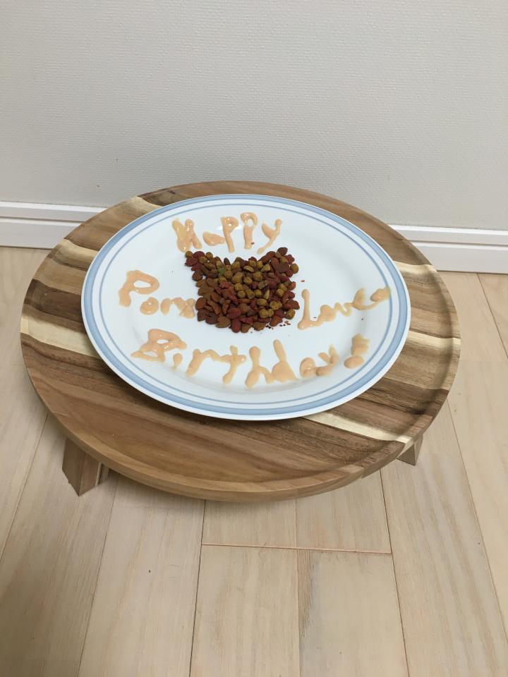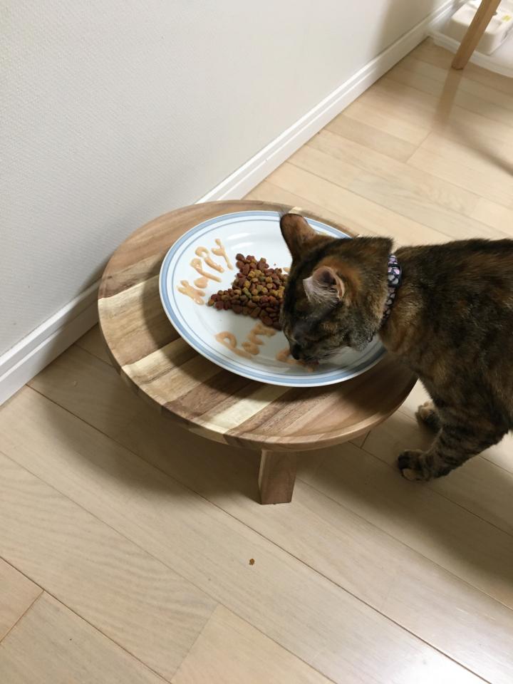 ホントはケーキ🎂を買ってあげたかったけど外出できないので、ちゅーるとモンプチで。下手くそでデザインのカケラもないけど。