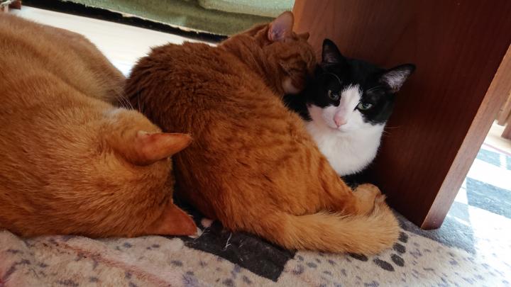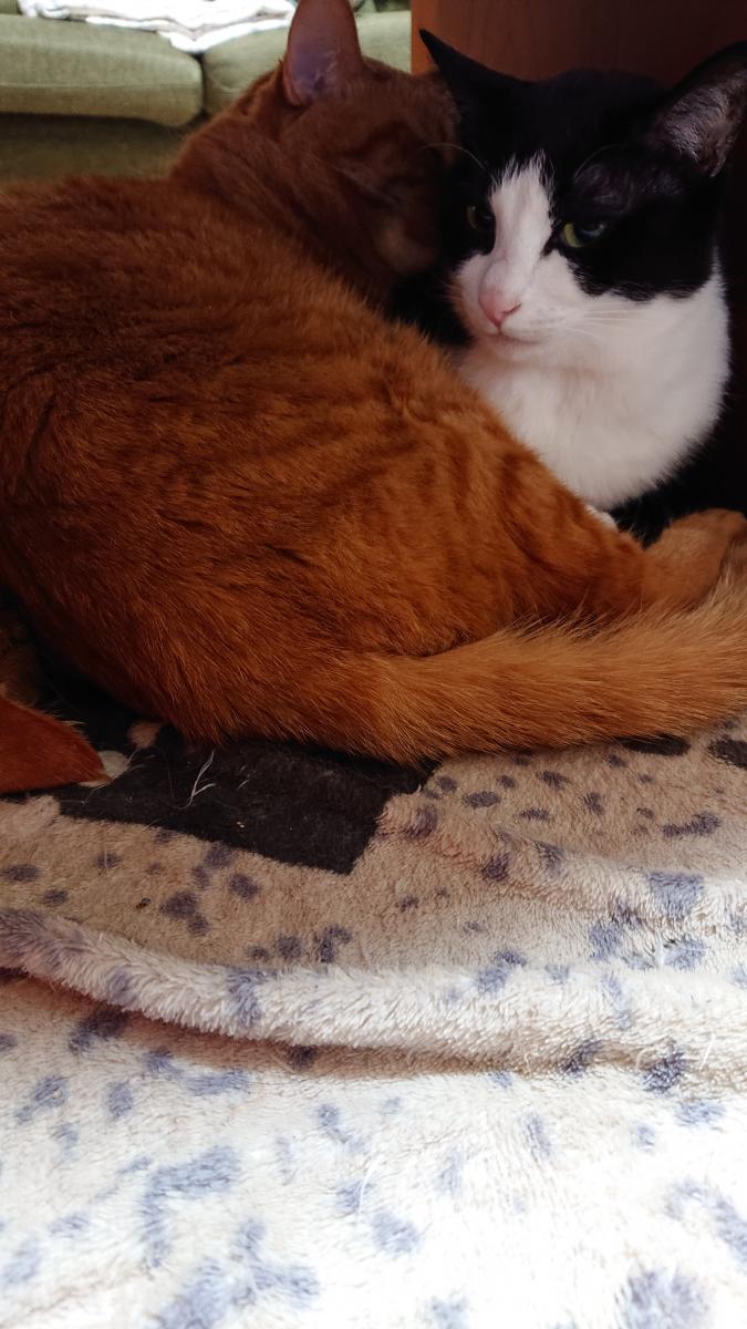 なんだ、このダラダラな巨猫ズ…で迷惑そうな春の表情、たまりませんね〜(*´∀`)♪