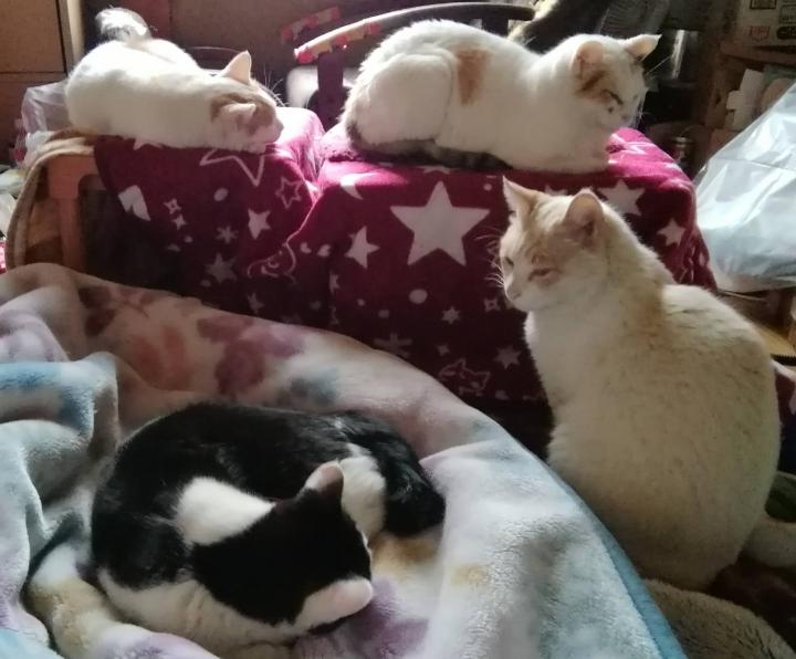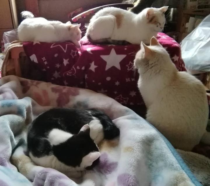 こたつ上…まる以外の4にゃん。タマはここにこだわり有り。