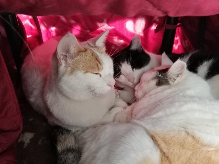 こたつ中…ミコ、はんた、ミミ。ゆっくり眠りたい時、家族のぬくもりが欲しい時に。