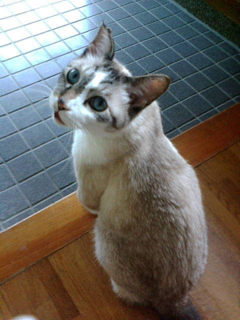 涼しくなって散歩に行きたくてしかたがないちこ、玄関で催促して待ってます。すっかり痩せて小さくなりました。若返ったでしょう?