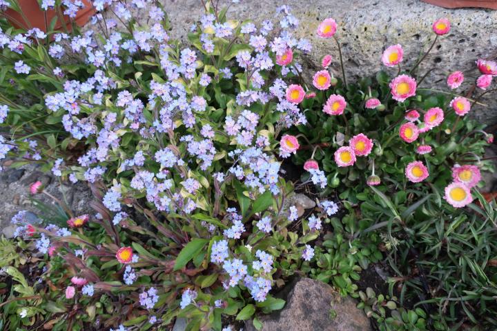 我が家の庭には、勿忘草と雛菊が可憐な花を咲かせていますよ。