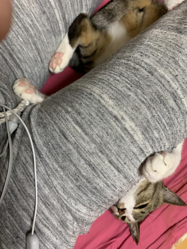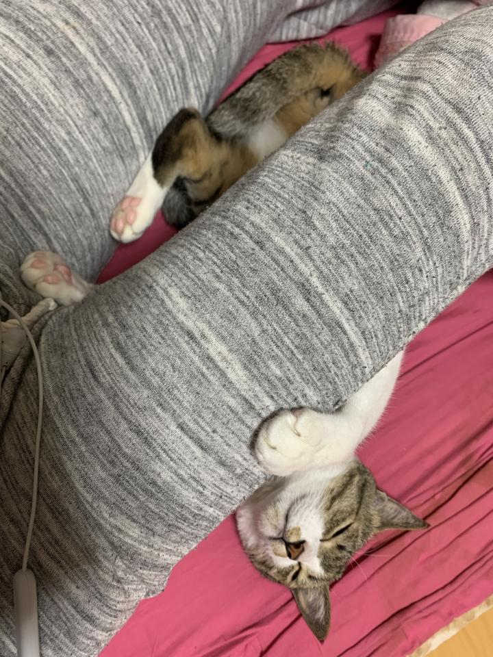 最近変な寝方にはまってるこゆず次女の足にわざわざ挟まりにきてねるそうです🤣