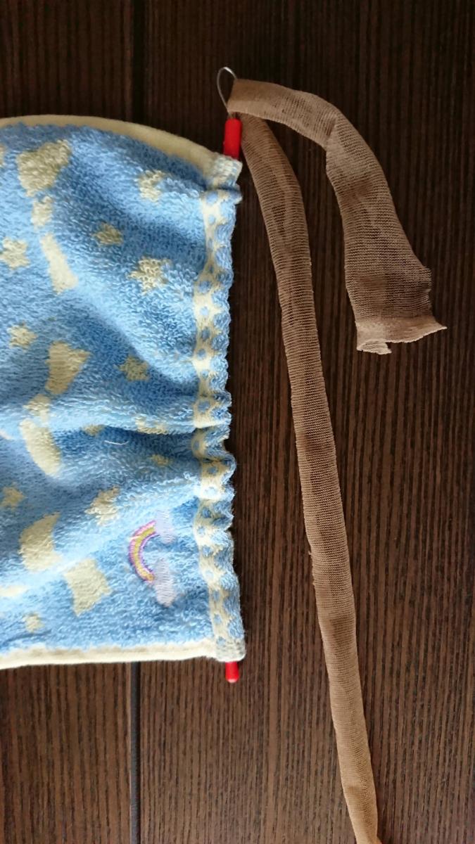 ②タオルハンカチの両端の筒状部分に紐とおしでストッキング紐を通す