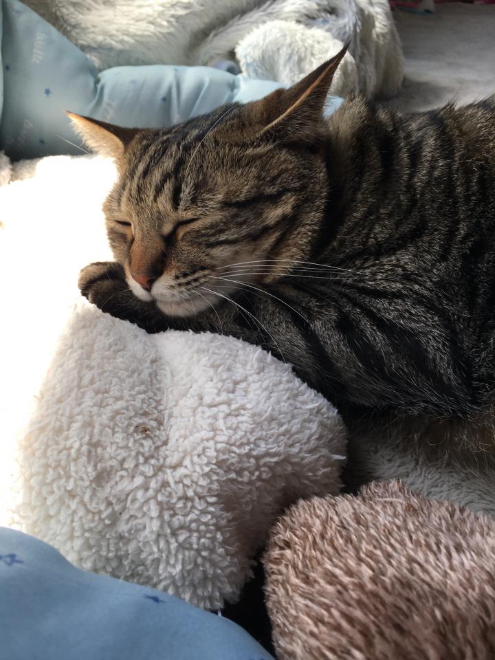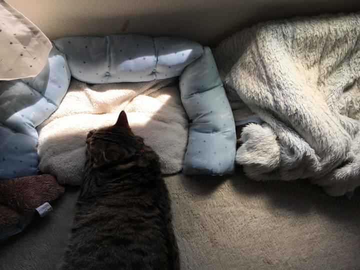 うちにあったクッションと、百均で買った座布団で簡単に作ったベッド。