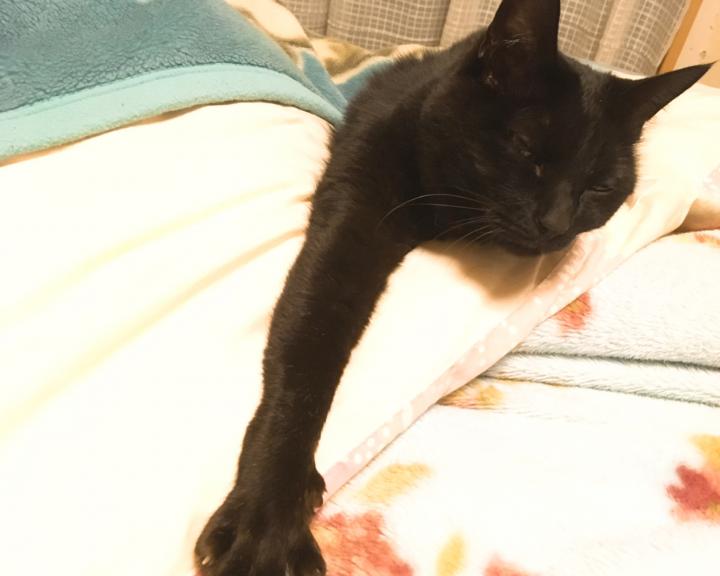 先住猫のクーおばさんは、以前子猫の泣き声を動画で流すと興味ありげに探したりしていたので、実物見ても大丈夫かな?と思っていたら、超威嚇。居心地が悪いのか一階の寝室に引きこもり、リビングにはほとんど姿を見せず。私のベッドで寝ていたので優越感を感じつつ、枕が黒毛まみれなのでコロコロ。