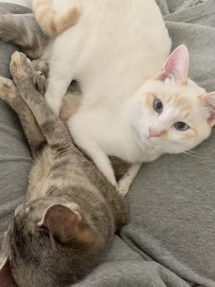 私めの足の間でくつろいでおられるのですよ、可愛いモフモフ達が。なんと2匹も。