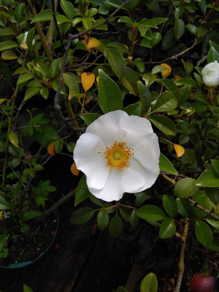 ナニワイバラです。中国原産、常緑(関東あたりだと)でとても