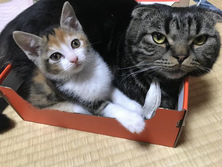 当たり前の顔してミャオが入ってる箱に入り込むビビさん…ミャオは迷惑顔です笑
