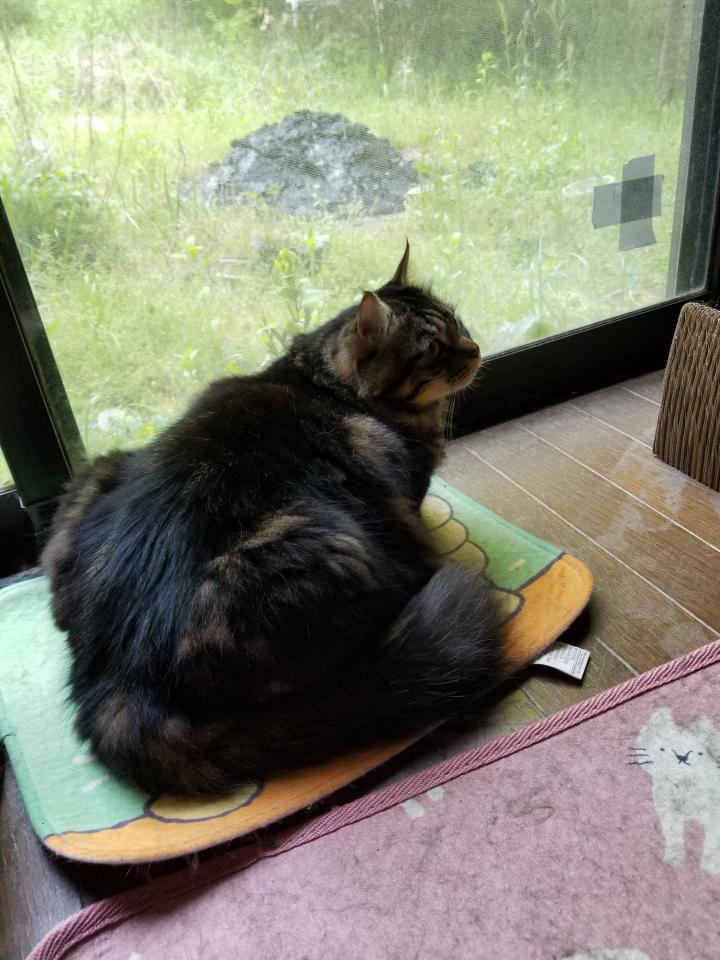きなこと一緒に、ゆずとおはぎも外を見てたけどゆずはきなこの迫力に驚いてどこかへ逃げて、おはぎは怒り狂うきなこの後ろに逃げて、後ろからチラチラ覗いてた❗(笑)