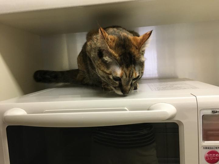 チーズケーキ焼いてる間、ゆずポンはケージの中に。レンジの上が大好きなポンズは終わってから早速登ってましたが、気持ちが先走って、後ろにズルッと落っこちてる!