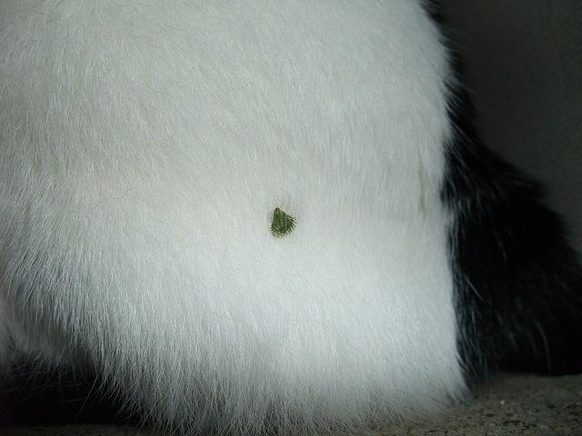 お腹がすいた~って玄関で大騒ぎしているので、マミヤ用の療養食を食べさせようと器に盛って、ふとしっぽを見たら緑の粒々がくっついました。